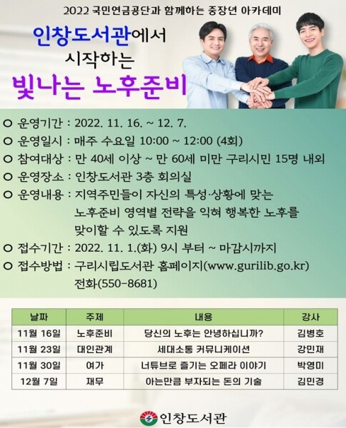 백경현 구리시장은 “100세 시대를 맞이해 중장년층의 노후 준비에 대한 관심이 높아졌다 이번 프로그램을 통해 시민들이 본인의 상황에 맞는 안정적인 노후를 설계하는데 도움이 되길 바란다”고 전했다.