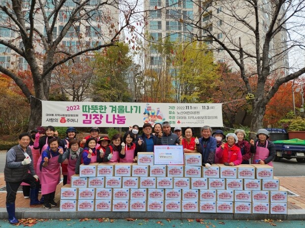 대야동 지역사회보장협의체는 11월 1일부터 11월 3일 삼일간 동행정복지센터 옆 노산어린이공원에서 독거노인, 장애인 등 취약계층에 전달할 김장김치를 직접 담가서 가구당 10kg 1박스씩 전달했다.