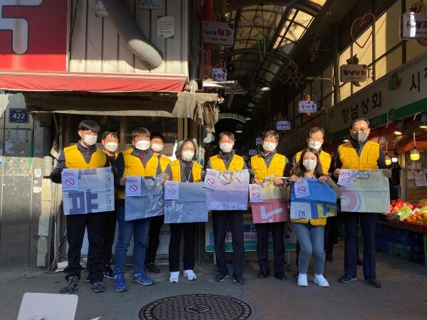 공단은 게시기간이 끝난 폐현수막을 재활용해 만든 장바구니를 용현시장에서 무료로 배부했으며 이달 24일부터 1회용 비닐봉지 판매 및 사용이 제한되는 자원재활용법 개정 내용을 함께 홍보했다.