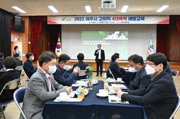 이날 교육은 이충우 여주시장과 부시장, 실국장 등 간부공무원과 정병관 여주시의회 의장을 비롯한 시의원 6명, 그리고 산하기관장 55명이 참석한 가운데 성희롱에 대한 경각심과 성인지 감수성을 제고해 건전한 직장분위기를 위한 고위직 책임과 역할을 강조하는 내용으로 진행됐다.