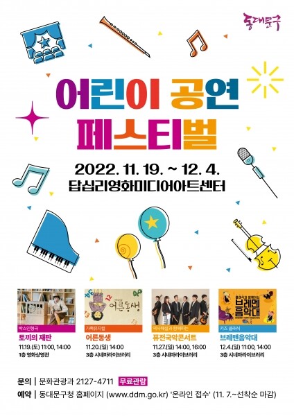 ‘어린이 공연 페스티벌’은 동대문구 누리집 ‘온라인 접수’란에서 신청 가능하며 선착순 약 700명을 모집한다.