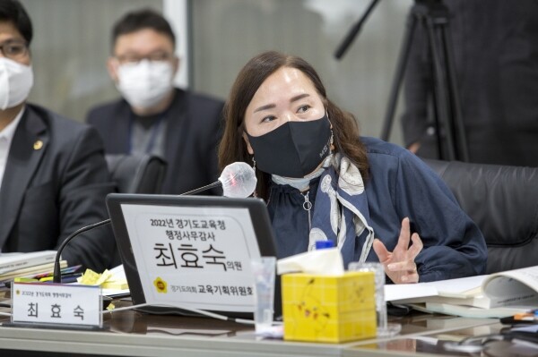 한편 최 의원은 지난 4월 발생한 부천 과학실 실험실에 대한 안전대책, 유통기한이 있는 코로나 키트 등 방역물품 처리 계획, 급식실 조리사가 부재 중일 때 대체식 관련해 빵과 우유로 대체식이 지급됨에 따라 하루 중 점심만 제대로 먹는 아이들에게 영양불균형이 발생할 수 있으므로 균형에 맞는 대체식 제공 방안 요구 등의 질의를 이어 나갔다.