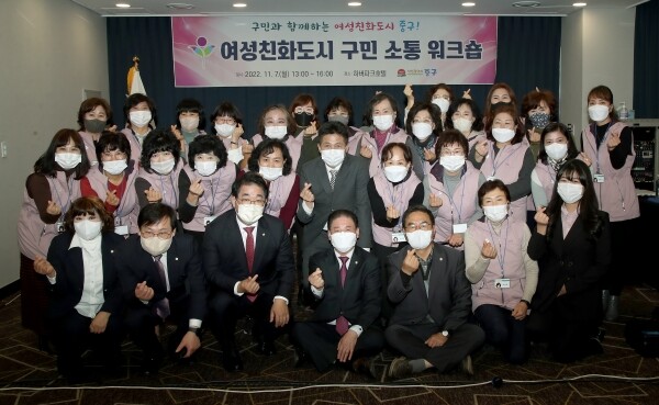 김정헌 구청장은 “오늘 워크숍을 계기로 보다 많은 구민이 여성친화도시 조성에 동참해 조화롭게 상생 발전하는 행복한 중구를 만들어 나갔으면 하는 바람”이라며 “중구가 여성친화도시로 신규 지정된 만큼 여성친화도시 조성을 위해 역량을 최대한 쏟아부어 소외되는 사람이 없도록 평등한 참여와 소통을 통해 구민이 행복한 도시 중구를 만들어 나가겠다”고 말했다.