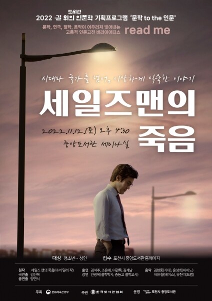 현대 희곡의 거장 아서 밀러의 대표작이자 퓰리처상 수상작인 ‘세일즈맨의 죽음’을 연극배우 4인의 축약극 철학박사 안광복이 들려주는 작품 해석 및 인문 특강 강연자와 배우가 함께하는 상황극 기타·피아노·베이스·드럼 전문연주자 4인의 음악연주가 더해진 콘서트 형식으로 진행될 예정이다.