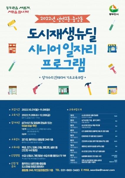 교육 신청은 수강신청서를 작성해 이메일로 접수하거나 생연2동·중앙동 도시재생현장지원센터에 방문해 제출하면 되며 기타 문의는 전화로 하면 된다.