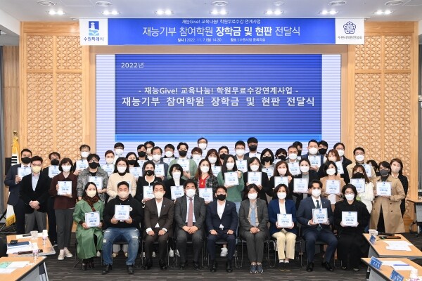 한편 수원시학원연합회는 지난 10월 15~16일 수원컨벤션센터에서 연 ‘2022 수원시학원연합회 나눔바자회’ 수익금 500만원을 “저소득층 학생 장학금으로 사용해 달라”며 수원시에 전달했다.