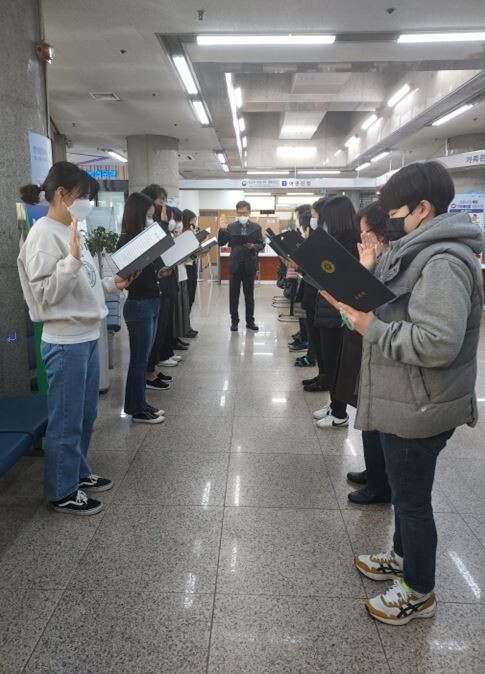 친절 다짐문에는 민원인을 맞이할 때 첫인사, 눈 맞춤, 정중한 언어, 미소, 정확한 업무처리, 끝인사 등 13개 항목의 친절응대 요령이 포함돼 있으며 직원들이 순차적으로 다짐문을 낭독하고 선서를 통해 실천 의지를 다진다.