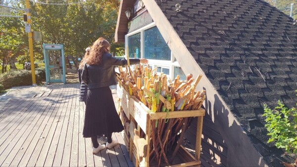 광교산 등산안내소 앞에 지팡이 200개를 비치해 누구나 이용할 수 있도록 했다.