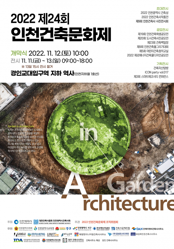 1999년 처음 개최된 이후 24번째를 맞는 올해 ‘인천건축문화제’는 “Garden In Architecture”를 주제로 ‘인천시 건축상’등 공모전 전시회를 비롯해 건축자산 심포지엄, 스마트 에코시티 컨퍼런스 등이 마련돼 있다.