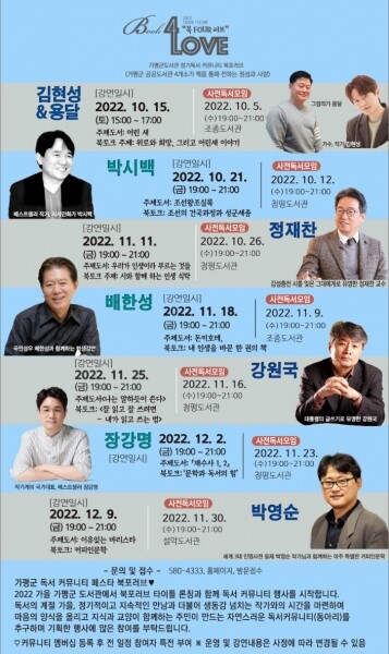 올 해 12월 9일까지, 가평군 도서관에서 지속가능한 생활 속 독서습관 진흥을 위해 진행되는 정기독서 커뮤니티 행사 ‘북포러브’는 엄선된 작가의 강연을 즐길 수 있는 ‘북토크’와 본 행사를 알차게 즐기기 위해 독서·독후활동을 함께하는 ‘사전 독서모임’으로 이루어진 프로그램이다.