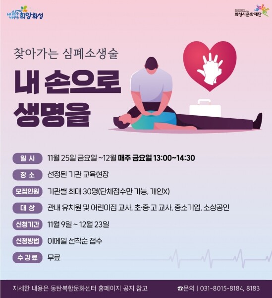 그러나 이번에 진행하는 ‘내 손으로 생명을’ 교육은 현장으로 찾아가는 현장밀착형 교육으로 화성시 소재 직장 재직자의 생활안전역량 향상에 도움이 되고자 기획됐다.