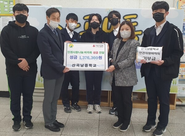 이번 성금은 지난 10월 19일 산곡남중학교 백마제 축제 중 진행한 인권사랑나눔바자회에서 학생, 학부모, 교직원으로부터 기증받은 도서 의류, 생활용품 등의 판매수익금을 모아 마련한 것이다.