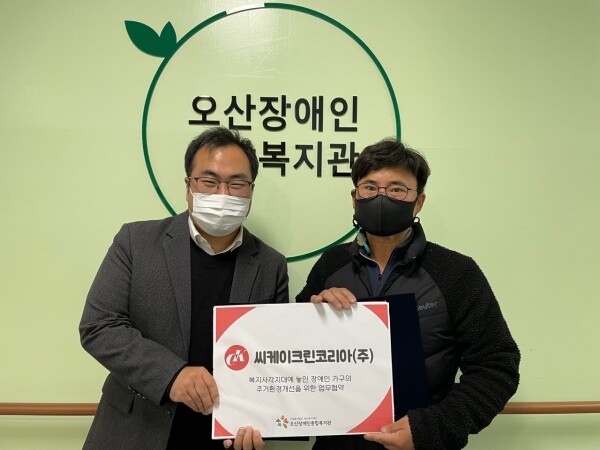 성도규 오산장애인종합복지관장은 “주거환경이 취약한 가정을 위해 함께 뜻을 모아주신 씨케이크린코리아에게 감사드리며 우리 복지관도 복지 사각지대에 놓은 장애인을 위한 지원을 지속하겠다”고 밝혔다.