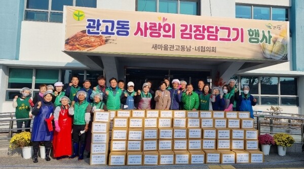 매년 실시하고 있는 사랑의 김장나누기 행사는 새마을남녀협의회 회원을 주축으로 관고동 사회단체장 등이 참여했고 동절기를 든든하게 이겨낼 수 있도록 600여 포기의 김장 김치를 독거노인, 마을 경로당 등 관내 이웃 및 소외계층에게 전달했다.