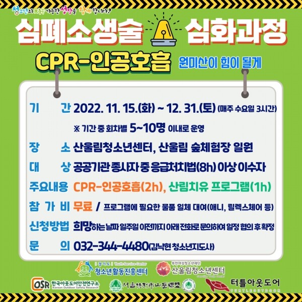 이에 산울림청소년센터는 정서적인 안정과 스트레스를 감소시켜 일상 회복을 돕기 위해 산림치유 프로그램을 제공하고 심폐소생술 심화과정을 통해 재난과 응급상황 발생 시 올바른 대처 방법과 타인의 생명을 지키기 위한 공공기관 종사자의 능력을 함양해 지역사회 속에서 공공기관의 사회적 책무를 다하겠다는 계획이라고 전했다.