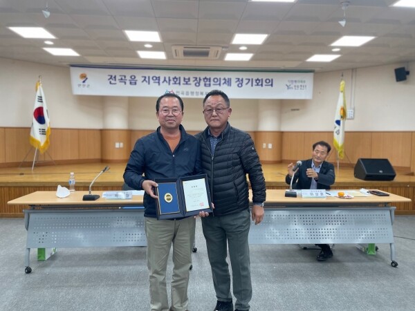 박수철 전곡읍장은 지난 10일 전곡읍 지역사회보장협의체 제5차 정기회의에서 박성관 위원에게 표창장을 수여하며 지역사회를 위한 선행에 감사와 축하의 말을 전했다.