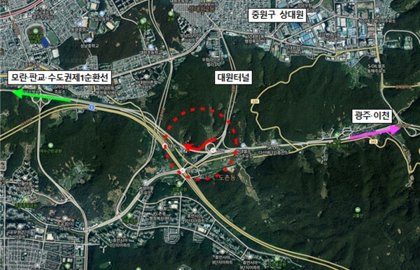 중원구 상대원동에서 모란·판교·수도권제1순환선 방향으로 가려는 차량이 신규 도로를 이용하면 정체나 우회 구간 없이 바로 갈 수 있다.