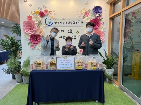이날 복지관에 전달된 치킨 20마리는 양주시 관내 재가 장애인 가정에 지원됐다. BHC 양주백석점은 앞으로도 양주시장애인종합복지관과 손 잡고 지역 사회에서 지속적으로 후원활동을 이어나갈 예정이다.