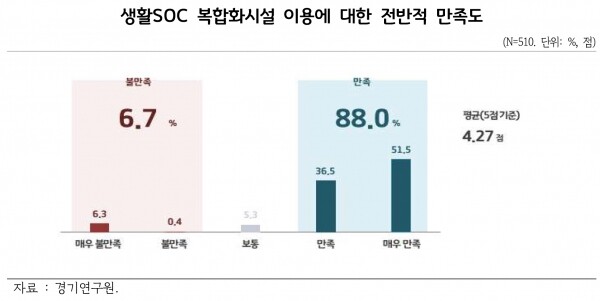 2022년 7월 15~27일 화성시 서연이음터, 파주시 중앙도서관, 오산시 보육타운 등 도내 3개 생활밀착형 사회기반시설 복합화시설 이용자 510명을 대상으로 생활밀착형 사회기반시설 복합화사업에 대한 정책만족도를 조사한 결과, 응답자의 88%가 시설 이용에 대해 만족한다고 응답했으며 접근성과 이동 시간의 단축, 저렴한 이용료, 다양한 기능 및 프로그램의 연계성 등의 측면에서 높은 만족도를 보였다.