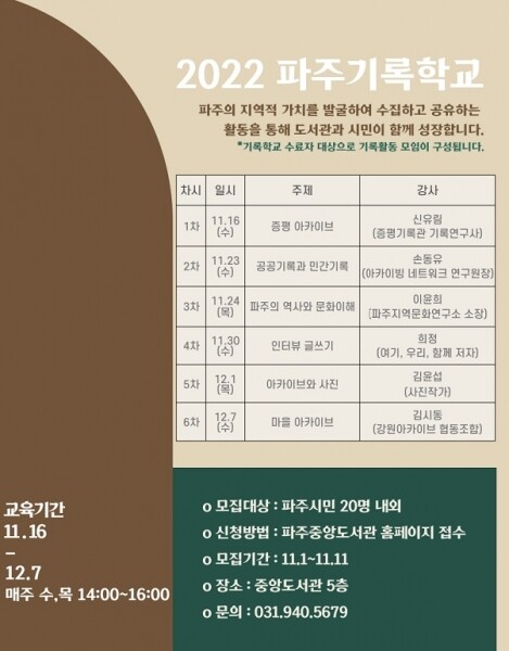 권예자 중앙도서관장은 “파주의 기록사업은 택지개발, 인구 유입 등 빠른 도시화 속에서 지역의 정체성을 살리고 쉽게 잃어버릴 수 있는 소중한 기억 자산들을 남기는 과정에서 시민과 함께하는 가치 있는 일“이라며 ”2022년 파주기록학교에 관심 있는 시민들의 많은 참여 바란다“고 말했다.
