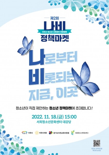 나비정책마켓은 1부 기관장과 청소년이 함께하는 토크콘서트를 진행해 소통의 시간을 갖고 2부 정책마켓에서 청소년들이 직접 발굴·제안한 이천시정책을 마켓형식으로 발표·전시하며 판매할 예정이다.
