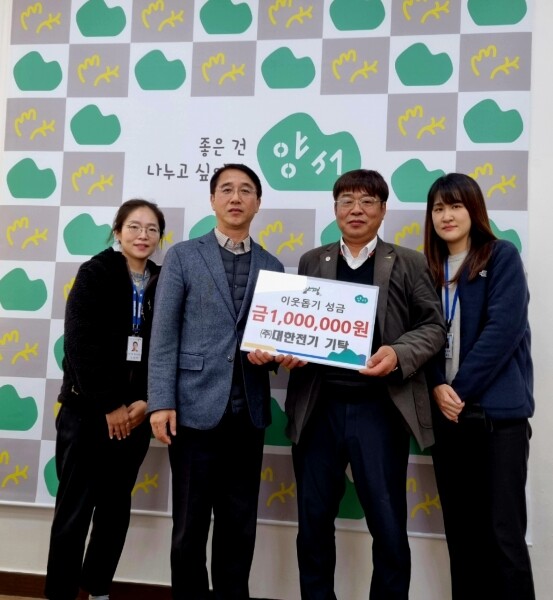 한구현 양서면장은 “어려운 경기에도 매년 이렇게 타인을 위해 나눔의 미학을 보여주시는 ㈜대한전기 이춘산 대표이사님께 감사의 말씀을 전한다”며 “보내주신 성금은 꼭 필요한 곳에 쓰일 수 있도록 하겠다”고 전했다.