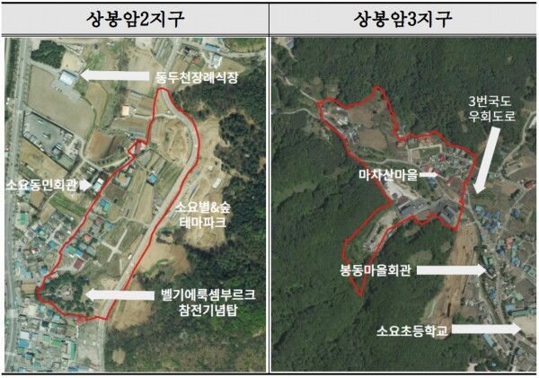 상봉암2지구는 59필지, 약 6만㎡이고 위치는 소요동민회관 일원이며 상봉암3지구는 118필지 약 6만㎡이고 위치는 봉동마을이다.
