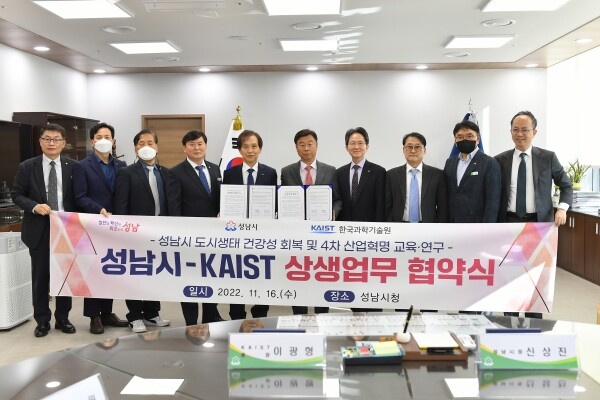 시는 16일 오후 1시 30분 시장 집무실에서 신상진 성남시장과 이광형 KAIST 총장 등이 참석한 가운데 ‘도시생태 건강성 회복 및 4차 산업혁명 교육·연구 상생 업무협약’을 했다.