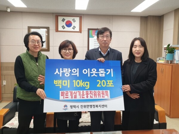 이상봉 진위면장은 “이웃에게 관심을 갖고 봉사해주시는 바르게살기운동 평택시 진위면 위원회 위원장 및 회원들에게 진심으로 감사드리며 힘든 분들에게 잘 전달하겠다”고 감사의 마음을 전했다.