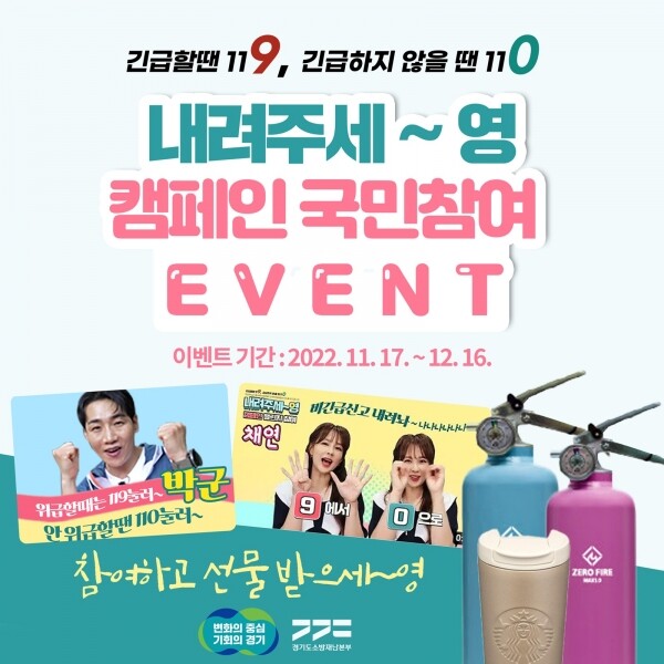 홍장표 경기도 소방재난본부 생활안전담당관은 “올 상반기부터 비긴급 신고자제를 당부하는 내용의 내려주세영 캠페인을 대대적으로 펼쳤고 불조심 강조의 달을 맞아 국민들을 대상으로 이벤트를 추진하게 됐다”며 “올바른 신고 문화가 자리잡을 수 있도록 국민참여 이벤트에 많은 관심과 참여 부탁드린다”고 말했다.