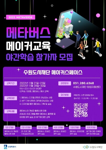 수원시 관계자는 “메타버스에 관심 있는 청소년, 시민은 누구나 교육에 참여할 수 있다”며 “ICT 관련 첨단 기술·장비를 활용할 수 있는 우수한 인재를 양성하기 위해 다양한 교육을 추진하겠다”고 말했다.
