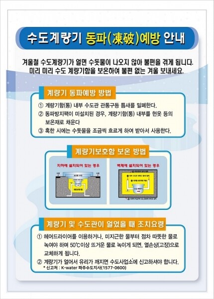 수도 검침 시 홍보, 수질전광판, 리플릿 등을 활용해 주민들의 협조를 당부하고 있으며 동파 예방법이 담긴 요금고지서를 11월부터 배부해 홍보할 계획이라고 전했다.