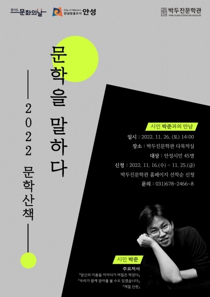 박두진문학관은 지난달 29일 1차 프로그램 ‘2022 문학산책: 문학을 체험하다’를 통해 문학체험부스와 올해의 안성 문인 토크콘서트를 진행했고 오는 11월 26일 진행할 2차 프로그램 ‘2022 문학산책: 문학을 말하다’로 박준 시인과의 만남을 준비하고 있다.