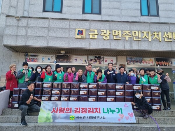 안효순 부녀회장은 “전달된 김장김치가 관내 어르신 등 이웃들의 월동준비에 조금이나마 보탬이 되기를 바란다”며 “바쁜 와중에도 함께해주신 부녀회원 모두에게 감사드리고 앞으로도 지역 어르신에 대한 공경의 마음과 이웃 사랑을 실천하는 금광면 새마을부녀회가 되겠다”고 전했다.