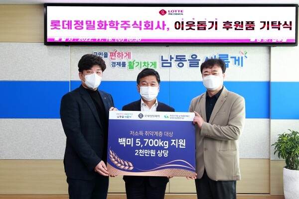 롯데정밀화학은 지난해에도 인천 남동구에 저소득층 이웃돕기를 위한 백미 10kg 666포를 후원하며 기업의 사회적 책임 실천에 앞장서고 있다.