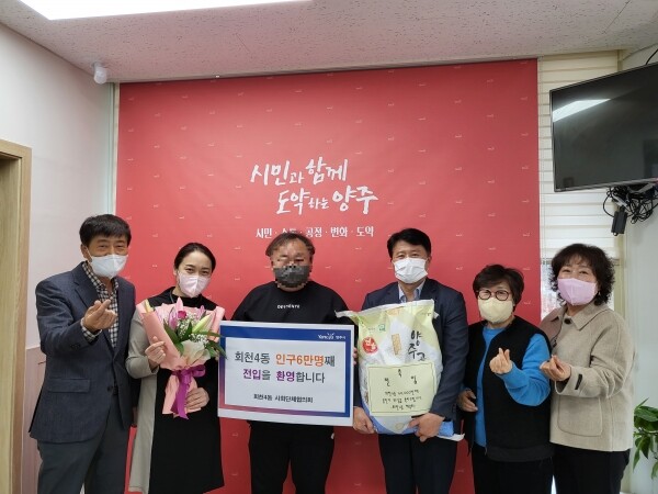 양주시 회천4동은 지난 16일 행정복지센터에서 인구 6만번째 주민이 된 주인공을 환영하는 자리를 가졌다.