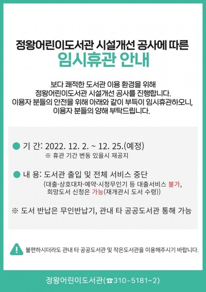 이에 정왕어린이도서관은 시민들의 안전을 위해 오는 12월 2일부터 12월 25일까지 임시휴관에 들어간다.