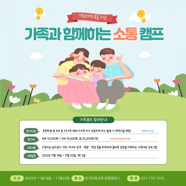 김제선 경기도평생교육진흥원장은 “이번 캠프를 통해 코로나19로 지친 도민들이 지친 심신을 달래고 가족간 유대감을 키울 수 있는 좋은 시간이 되길 기대한다”고 말했다.