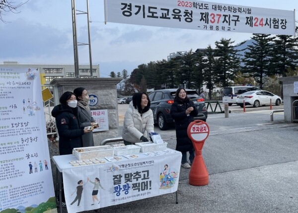 ?김보니 가평군청소년상담복지센터장은 “이번 아웃리치가 대학수학능력시험을 치루는 응시생들에게 힘이 되어 좋은 결과가 있으면 좋겠고 도움이 필요한 청소년들이 언제든 전화 또는 청소년상담복지센터로 방문해 상담 및 복지서비스를 받으면 좋겠다”고 전했다.