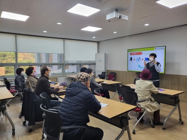 교육에 참석한 경로당 이용 어르신들은 스마트폰을 들고 열심히 따라했으며 키오스크 사용법도 익혔다.