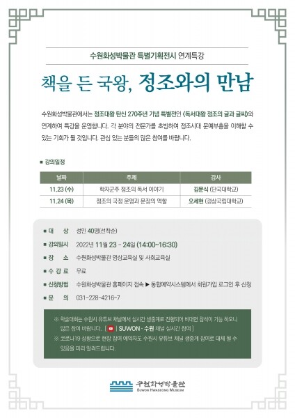 수원화성박물관 관계자는 “이번 전시연계 특강에서 정조대왕의 문화정책을 오랫동안 연구한 전문가들의 이야기를 들을 수 있다”며 “전시 내용을 이해하는 데 큰 도움이 될 것”이라고 말했다.