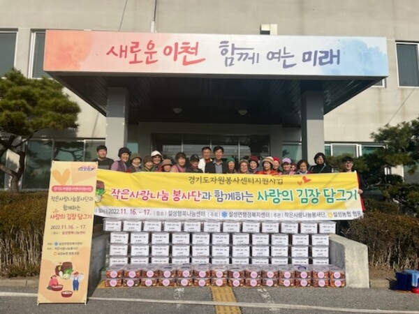 이날 행사는 작은사랑나눔봉사단이 지난 10월 경기도자원봉사센터 김장지원공모사업에 2021년에 이어 금년에도 재 선정되어 확보한 6백만원을 재원으로 했고 설성면과 설성농협이 공동 주최하고 봉사단원과 주민등 40여명이 참여한 가운데, 코로나19 방역수칙을 준수해 야외에서 진행됐다.