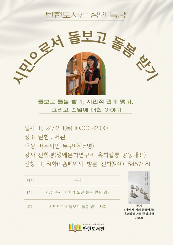 이현주 교하도서관장은 “이번 특강이 도서관의 주이용자인 중장년층 시민들이 서로의 고민을 함께 나누는 장이 되고 추후 독서모임 등 지속적인 연대활동의 토대로 발전하길 기대한다”고 말했다.