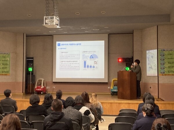 ‘교통약자 이동편의시설의 이해’를 주제로 강의한 정일교 부장은 교통약자, 이동편의시설 개념 보도, 횡단보도, 버스정류장 등 일상 속 다양한 이동편의시설 교통사고 원인 분석, 안전한 보행환경 조성 방안 등을 설명했다.