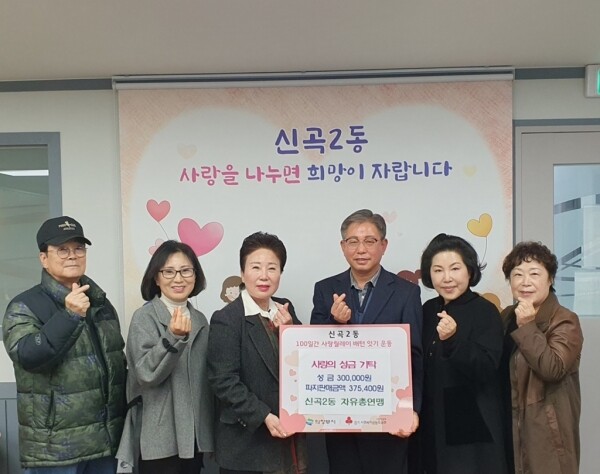 신곡2동 자유총연맹은 작년에 이어 올해에도 ‘100일간 사랑릴레이 배턴 잇기 운동’에 동참해 성금 30만원을 전달했으며 특히 김영애 회장이 개인적으로 모은 파지를 판매해 마련한 수익금 375,400원을 추가로 기탁하며 이웃사랑을 적극 실천했다.