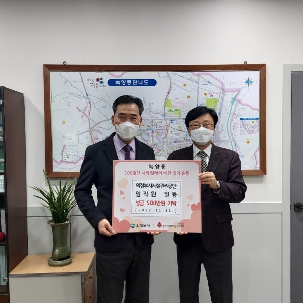 이날 성금 전달식에는 의정부시시설관리공단 본부장과 관계자가 함께 한 가운데, 홍정길 의정부시시설관리공단 본부장은 “힘든 시기에 어려운 이웃이 따뜻하게 겨울을 보내시길 바라는 마음으로 직원들이 마음을 모아 100일간 사랑릴레이 배턴 잇기에 동참한다”고 말했다.