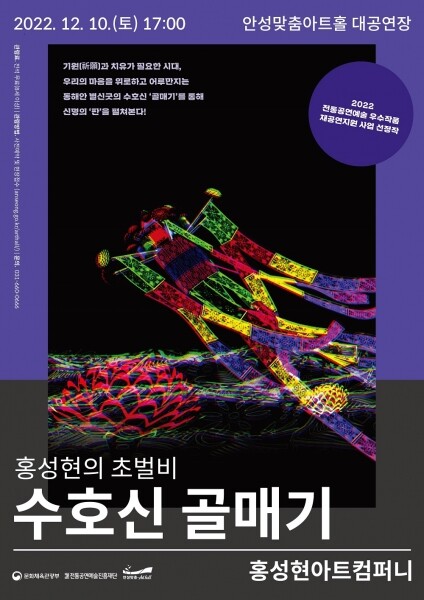 전통타악기와 현대적인 색채의 무속음악 그리고 미디어아트까지 참신함이 가득한 젊은 창작 기악 공연 ‘수호신 골매기’는 안성 시민의 문화 향수 기회 확대를 위해 무료로 진행되며 관람 신청은 안성맞춤아트홀 콜센터를 통해 사전 신청을 받는다.