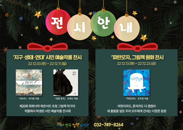 또 전시행사로 청학도서관이 ‘지구·생태·연대 시민참여 예술작품전시’를 준비했고 도서관별 이용객을 대상으로 그림책 원화전시회가 한달간 각 도서관에서 각기 다른 주제로 열린다.