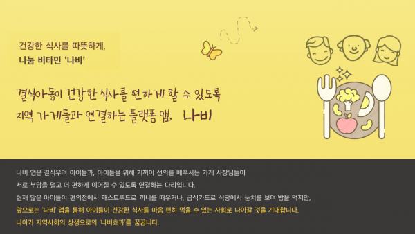 ‘나비’는 결식아동이 급식지원가게 정보를 한눈에 파악하고 예약할 수 있으며 결식아동을 돕고 싶은 점주는 원하는 만큼 예약을 받을 수 있다.