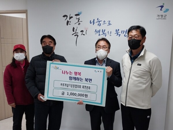 이진모 북면장은 “2년여간 코로나19로 어떠한 행사도 개최하지 못하고 우울한 시기를 보냈다 바르게살기운동협의회 북면지회 정지선 회장을 비롯한 회원들의 정성으로 후원하는 성금을 관내 어려운 이웃에게 그 마음까지 전달하도록 하겠다 이웃을 위해 마음을 여는 모든 분들에게 감사를 드린다”고 전했다.